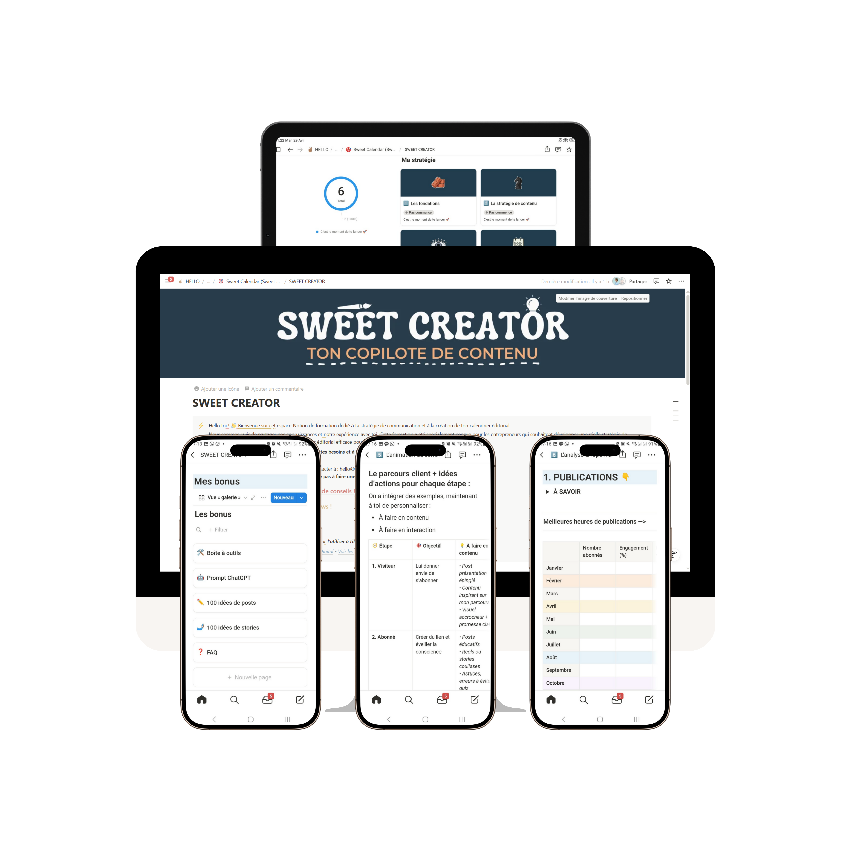 Oh que oui. Sweet Creator, c’est un vrai outil de pilotage complet, pas juste un tableau avec des cases. Tu bosses ta stratégie, tu suis tes résultats, tu gères ta routine, tu t’organises au quotidien… et tu gagnes un max de temps.
